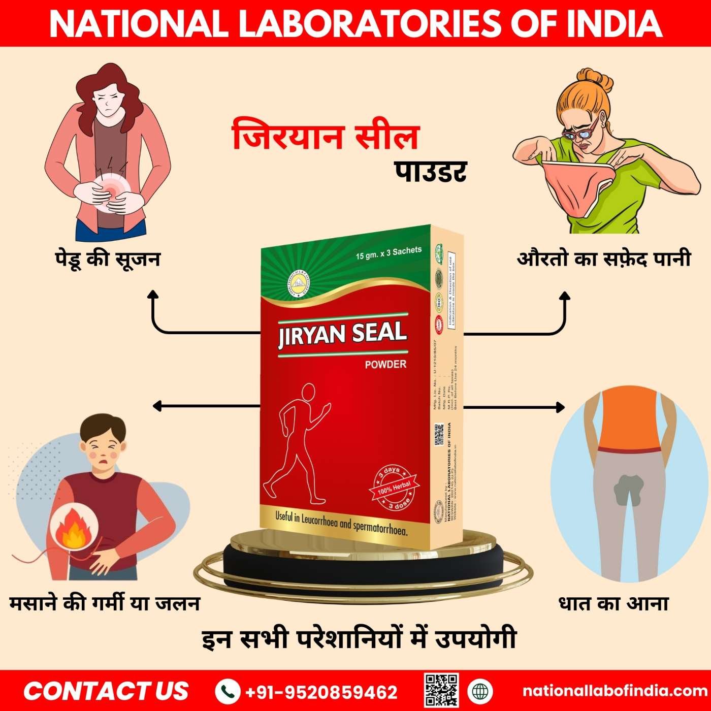 Jiryan Seal Powder:- Natural relief for Leucorrhea, our specially formulated product is designed to balance and support feminine health. Made with time-tested herbs, it effectively reduces excessive white discharge, eliminates discomfort, and promotes vaginal hygiene. This blend works to restore normal discharge levels, soothe irritation, and maintain a healthy reproductive system. Safe, gentle, and 100% natural, it provides holistic care for women's health and well-being.Additional Information